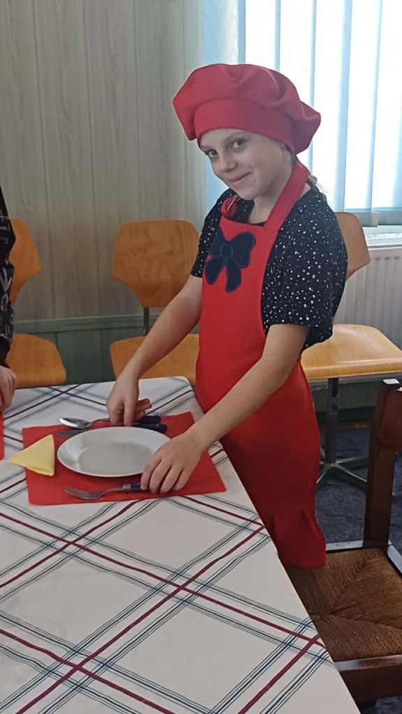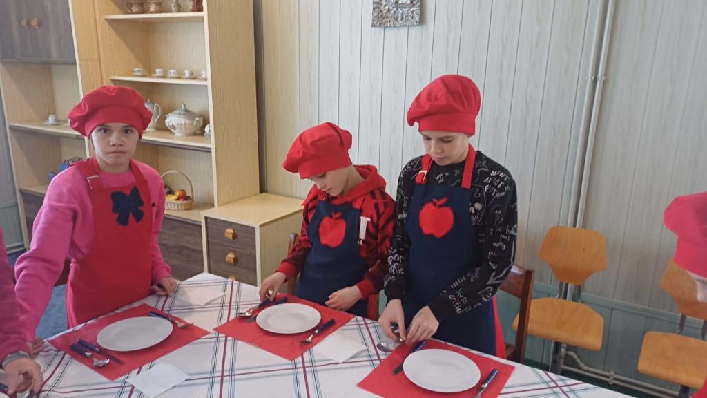 Вчитель соціально-побутового орієнтування Людмила ТКАЧЕНКО провела з учнями 5 класу практичне заняття, під час якого діти вчилися правильно сервірувати стіл. Під час роботи учні ознайомилися з основними правилами сервірування, вчилися розкладати столові прибори, розміщувати посуд та серветки.