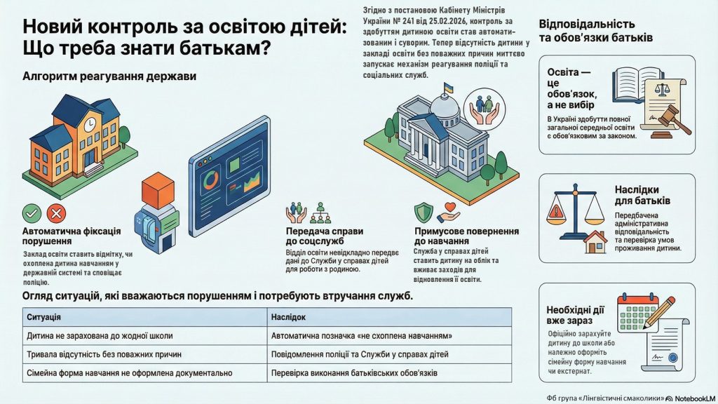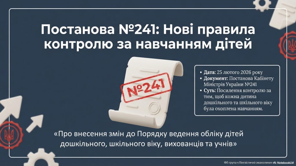 - 25 лютого 2026 року Кабінет Міністрів України ухвалив постанову №241, якою посилив контроль за тим, щоб кожна дитина дошкільного та шкільного віку була охоплена навчанням.Це рішення напряму стосується кожної родини.