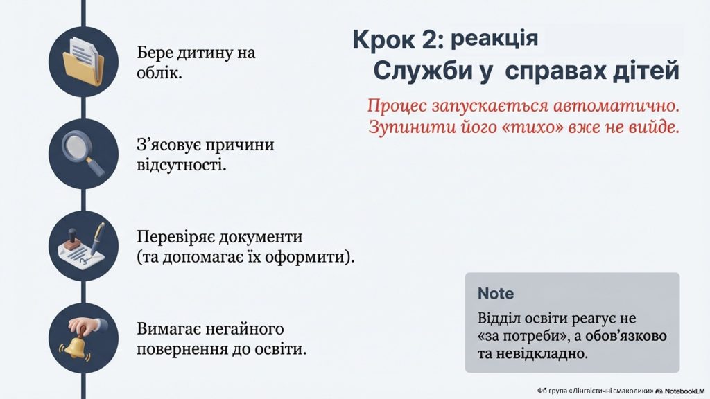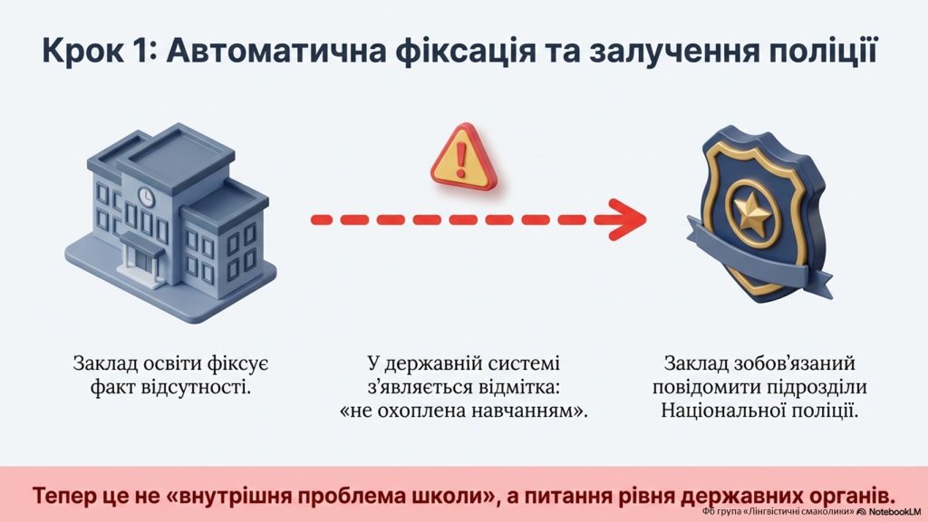 Що тепер відбувається, якщо дитина не навчається?- Заклад освіти фіксує факт і повідомляє поліцію. Якщо дитина не відвідує школу або взагалі не зарахована до навчального закладу: у спеціальній державній системі з’являється відмітка «не охоплена навчанням»;